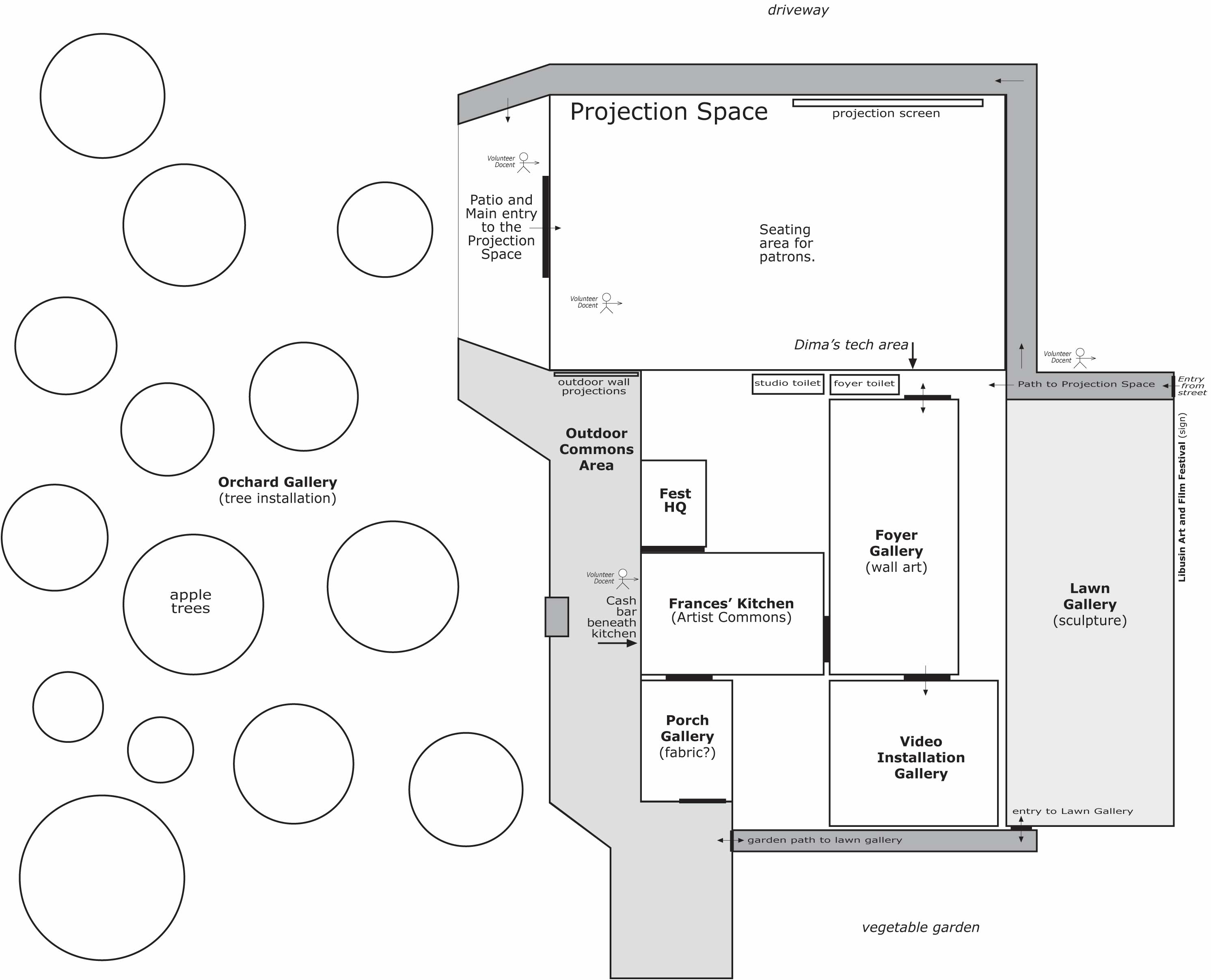 Festival 2010 Atelier Libušín, Libušín The Czech Republic August 21-28, 2010 A festival of contemporary art, video and film to be held in the small central Bohemian village of Libušín celebrating an international exposé of new film, video and contemporary art. Organizational Team Dan Senn (USA), Anja Kaufman (Switzerland), Zuzana Vlčková (Czech Republic), Martin Zet (Czech Republic), Frances Sander (UK), Dima Borzov (Russia). Atelier Libušín - Venues (see diagram) Projection Space: film festival projections Foyer Gallery: wall art (painting, drawings). Lawn Gallery: one large temporary sculpture/installation. Porch Gallery: sound installation (aviary?). Orchard Gallery: tree installation(s) (sound component?); installations on ground. Video Installation Gallery: video installation(s) Curatorial and Administrative Suggestions Videos and Film(Projection Space): All organizers Foyer Gallery: Zuzana, Frances Video and Sound Installation (Video Installation Gallery): Anja, Dan, Dima Sculpture (Lawn Gallery, Porch Gallery, Orchard Gallery): Martin Zet Co-directors: Dan, Anja, Zuzana Webmaster: Anja Tech coordinators: Dima, Anja Communications coordinator: Zuzana Facilities and Site Preparation: Frances, Dima, Anja?, Zuzana? Entry Coordinator: Frances, Anja, Zuzana (entrant notification, "your DVD has arrived...") Organizational Schedule August-September 2009 1. Determine exact dates for festival. 2. Identify any connections to existing events (i.e. Mayrau events). 3. Name festival (Libušín Art and Film Festival). Acquire domain name (LibusinArtFilmFestival.org). Begin developing simple, attractive informational website. 2. Agree on festival design and assignment of responsibilities listed here. 3. Determine categories of film/video to be shown: experimental, short narrative, etc. 4. Determine entry format: 1) DVD for film and video. 2) 5. International call for film and video? Regional call for installations and art? 4. Determine housing provisions: who will be allowed to stay at Atelier Libušín; nearby camping sites?; housing provided by local patrons during festival; hotel accommodations in Kladno and Prague. 5. identify transportation links from Prague and Kladno. These need to be part of festival website. 3. Identify any possible outside funding sources. 4. Determine ticket prices. (These should be kept low. Like 100kc for entire festival). October-December 2009 1. Initiate any possible grant applications. 2. Complete website with basic festival information, calls for films and art. All entries to be sent to Atelier Libušín. 3. Determine deadline for video, film, installation and art entries - June 1, 2010?. Ask artists to include with entries a photo scan, a digital still from the video or art work, biographic text. These can be used later on in website. IMPORTANT: No materials will be returned! 4. Place links in all possible sites international. January-May 2010 1. wait and continue preparations 2. collect packages; send out notifications that materials have arrive. June - July 2010 1. Select festival work. 2. Print posters if there is any money. 3. Notify entrants. August 2010 1. final preparation of festival site and equipment. 2. do festival. September 2010 1. Organize both a physical and online archive of festival. 2. Decide whether to do another festival in 2011 or 2012. |