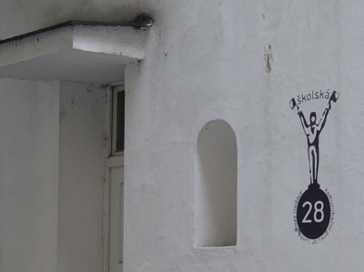 The workshop artist, Dan Senn, arrived in Prague three weeks prior to the main event and took I Ching readings at eight stationary performance sites. At each he asked the I Ching "What sounds will be appropriate for this space?" Then, using traditional sticks and the I Ching, he determined a set of hexagrams which pointed to a corresponding set of graphic lycons-a kind of sonic signature for that site and score for future performance. These symbols, a set of 3 to 4, were transferred to cloth flags in the workshops. In the end, eight flag-scores (see flag-score #2 below) were created for eight performance locations each situated within "marching" distance of one another . On the day of the main performance, the Space Band gathered in the early evening at the Skolska 28 Gallery and set off for the first stationary performance location while playing their instruments in the continuous ringing style. As the musicians moved through the narrow streets, the tight cluster of ringing sounds had the effect of enhancing the unique sonic characteristics of the narrow streets transfixing the band members and those who were along the parade route. As the musicians approached a performance site, they slowed, gradually became silent, then still, and began playing the score associated with that location. After a 5 to 10 minute performance, the Band set off for the next location, again, using the continuous ringing effect. This process repeated itself until the final location, the ninth location, at the NoD performance space, where all flags-scores were performed in concert |